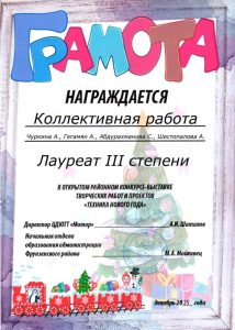 Поздравляем участников открытого районного конкурса творческих работ и проектов «Техника Нового Года» — воспитателей и детей групп «Ласточка», «Ручеёк» и «Мечта» с заслуженной наградой. Замечательные работы были представлены нашими талантливыми педагогами и детьми.